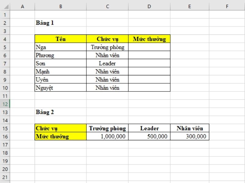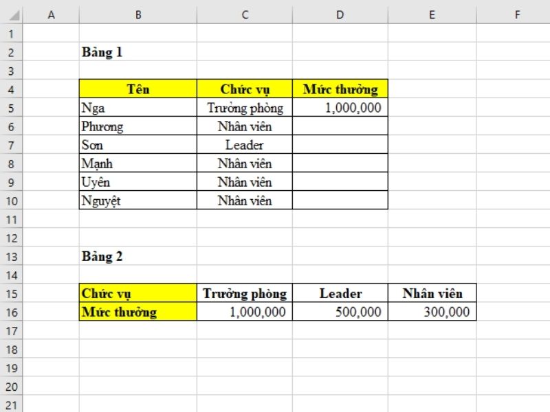 Ví dụ tiếp theo, chúng ta cần tính mức thưởng lễ trong bảng 1 và dữ liệu ở bảng 2.