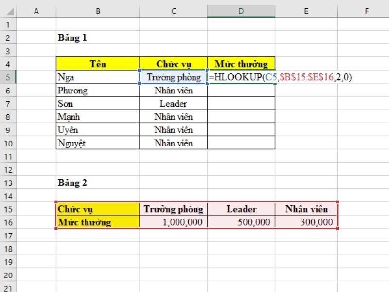 Hàm HLOOKUP sẽ tra cứu giá trị tại ô C5 trong Bảng 2 theo hướng từ trái sang phải. Khi tìm được giá trị khớp chính xác, nó sẽ trả về mức thưởng tương ứng từ hàng thứ 2.