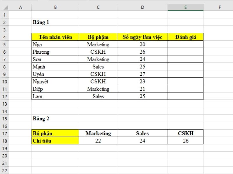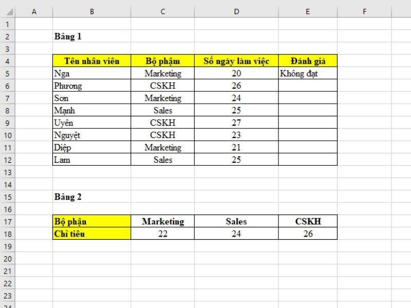 Trong một số trường hợp, bạn có thể tích hợp hàm HLOOKUP với hàm IF trong Excel để xử lý dữ liệu. Ví dụ, nếu nhân viên thuộc các bộ phận Marketing, Sales hoặc CSKH và có số ngày công mỗi tháng đạt từ 22, 24 hoặc 26 ngày trở lên, họ sẽ được đánh giá là “Đạt”, nếu ít hơn sẽ là “Không đạt”.