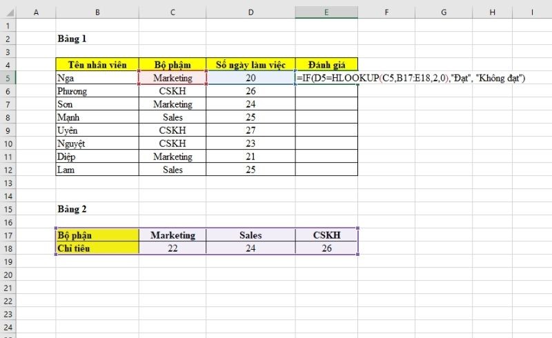 Hàm HLOOKUP sẽ tra cứu giá trị tại ô C5 trong bảng 2 để lấy số ngày làm việc chỉ tiêu tương ứng. Sau đó, hàm IF sẽ đối chiếu giá trị này với số ngày làm việc thực tế của nhân viên tại ô D5. Nếu số ngày làm thực tế đạt hoặc vượt số ngày chỉ tiêu, kết quả sẽ là “Đạt”; nếu không, kết quả trả về là “Không đạt”.