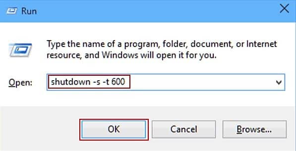 Bước 2: Nhập vào “shutdown –s –t [số giây]” và chọn OK. Số giây chính là thời gian đếm ngược cho đến khi tự động tắt máy tính Win 10. Chẳng hạn bạn nhập “shutdown -s -t 600” tức là sau 600 giây (10 phút) thì máy tính sẽ tắt.