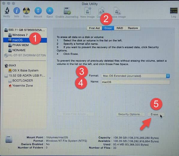 Tiếp tục bạn chọn phân vùng để cài macOS chọn thẻ Erase và để ý ở phần Format thì chọn Mac OS Extended (Journaled) và phần name thì đặt tên tùy ý sau đó nhấn Erase để tiến hành định dạng lại phân vùng theo chuẩn của macOS. Sau khi định dạng xong thì bạn tắt chương tình Disk Utility.