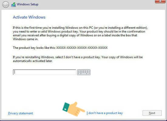 - Ở bước này, nếu bạn đã có sẳn khóa bản quyền Windows 10, bạn có thể nhập trực tiếp ở bước này. Nếu bạn đã kích hoạt Windows 10 trên máy tính này từ trước, bạn chỉ việc nhấp vào dòng “I don’t have a product key” để bỏ qua bước này.
