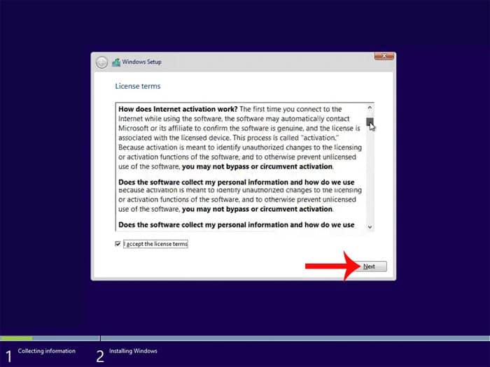 - Chọn vào I accept the license terms để đồng ý với điều khoản sử dụng từ Microsoft sau đó nhấn Next.
