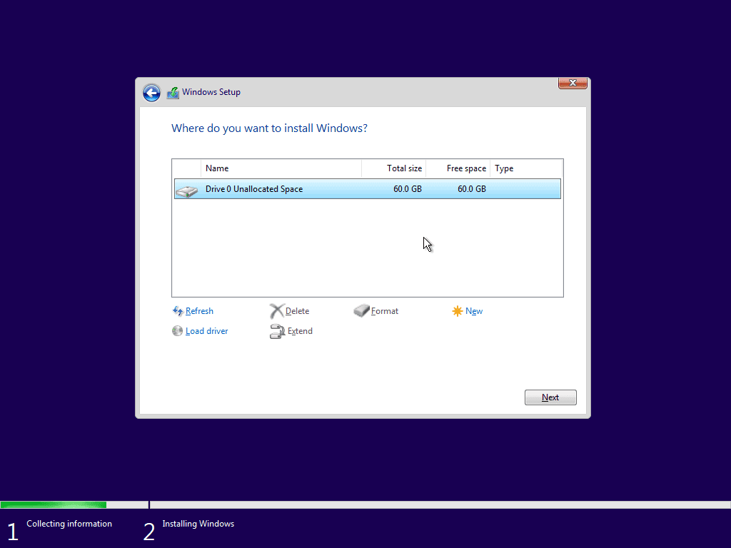 - Chọn vào ổ đĩa bạn cài Windows, lưu ý ổ này sẽ bị format (xóa toàn bộ dữ liệu) sau khi cài đặt Windows 10. Ngoài ra, một thông tin quan trọng nữa cần chú ý là phải chọn đúng ổ đĩa cần cài, nếu chọn nhầm ổ khác sẽ khiến máy tính của bạn mất dữ liệu. Sau khi đã chọn đúng ổ đĩa để cài đặt win 10, ấn next để tiến hành cài đặt.
