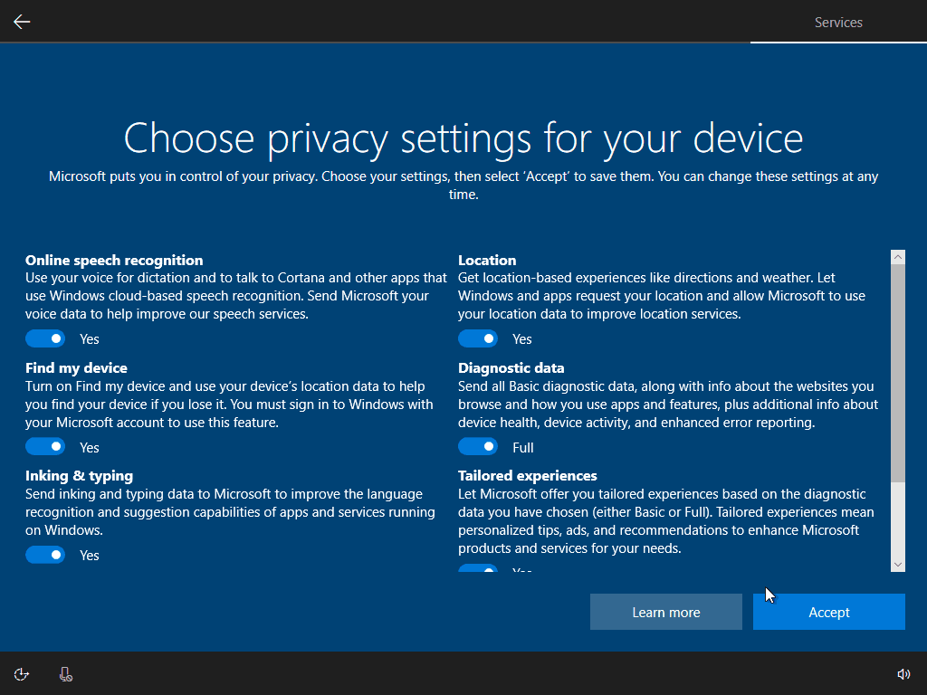 Nhấn Acpect để đồng ý các tùy chọn mặc định của Window 10.