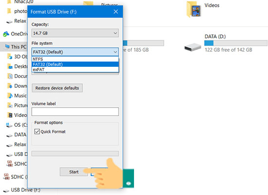 Bước 2: Chọn định dạng USB là FAT32. Định dạng này sẽ đảm bảo khả năng tương thích của USB cài win 10 chúng ta sắp tạo với tất cả các thiết bị, kể cả với những máy tính đời cũ.