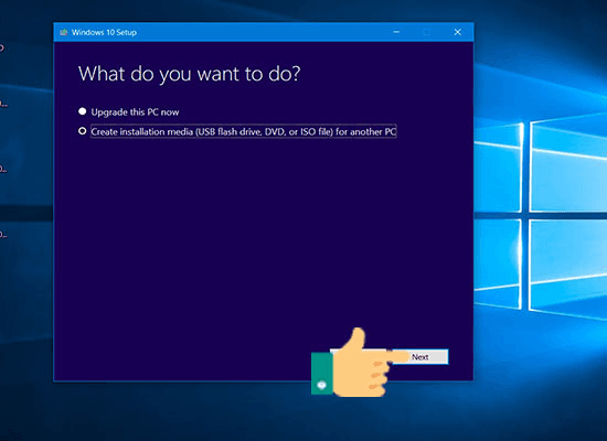 Phần mềm sẽ có 2 lựa chọn. Nó sẽ hỏi bạn rằng bạn muốn Update window hay muốn tạo file cài đặt win 10 cho USB? Tất nhiên, chúng ta chọn là tạo file rồi. Chọn Create installation media > nhấn next.