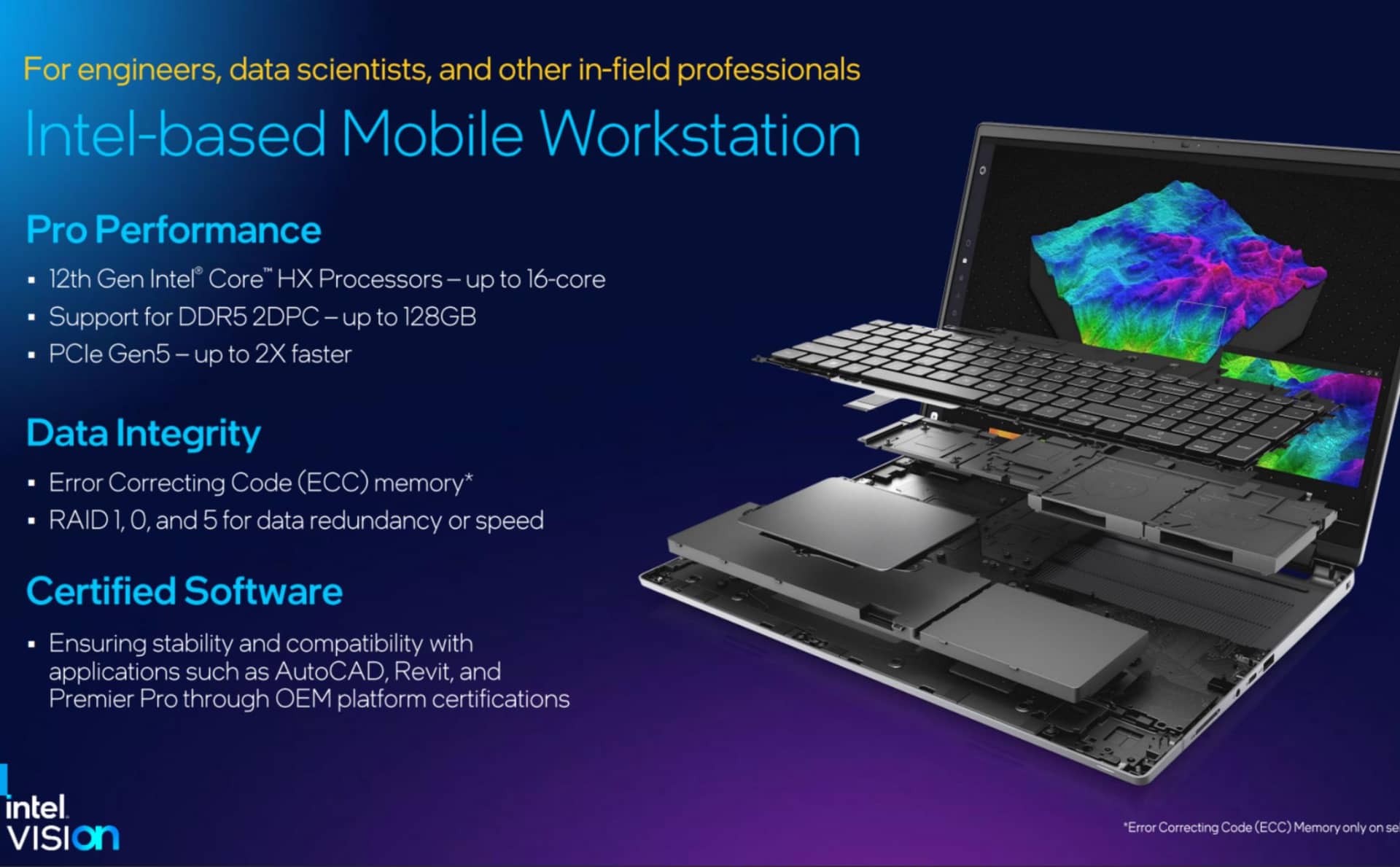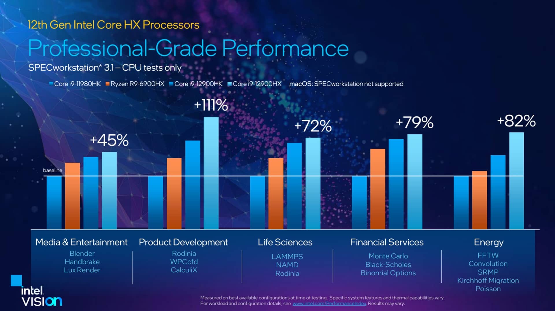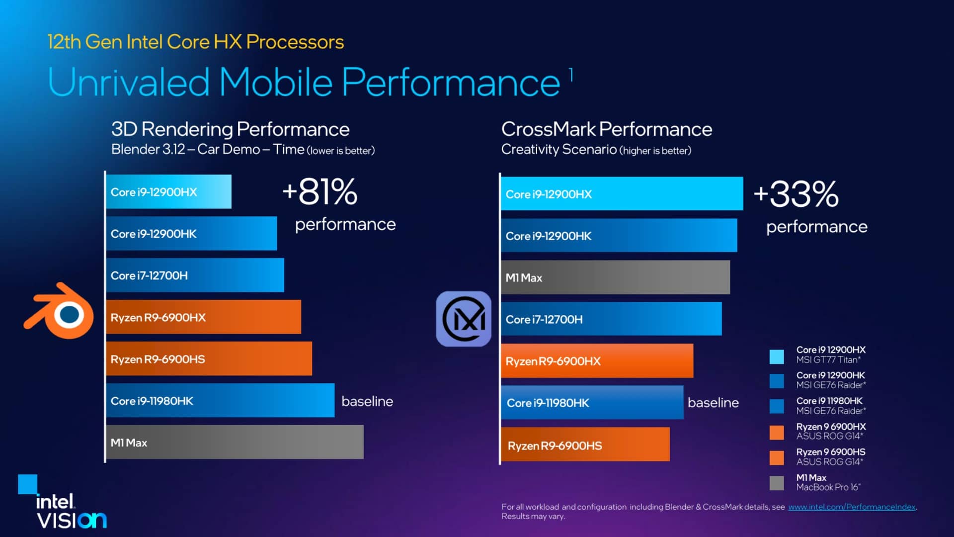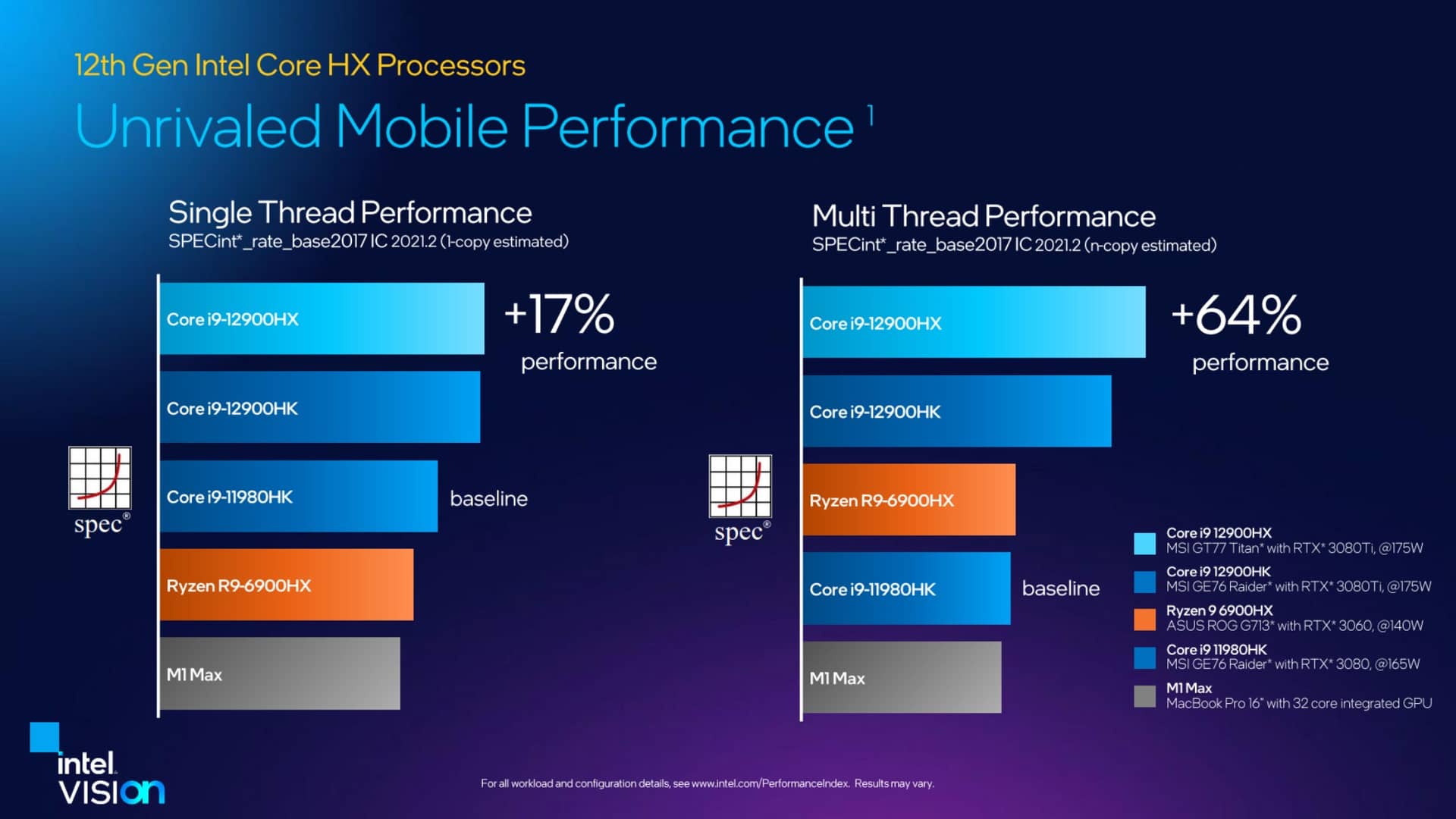 Hiệu năng của Alder Lake-HX cũng đã được Intel công bố và đội xanh khẳng định đây là nền tảng vi xử lý di động "không đối thủ". Đầu tiên với các bài benchmark hiệu năng workstation bằng bộ công cụ SPECint, hiệu năng đơn nhân của Core i9-12900HX cao hơn 17% so với Core i9-11980HK - flagship của dòng Tiger Lake-H, nhỉnh hơn đôi chút so với Core i9-12900HK - flagship của dòng Alder Lake-H và cao hơn đáng kể so với Ryzen 9 6900HX cũng như M1 Max của Apple. Hiệu năng đa nhân của Core i9-12900HX theo kết quả này cũng không đối thủ khi bỏ xa các đối thủ nhờ lợi thế 16 nhân.