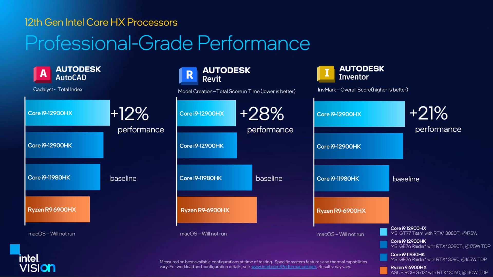 Hiệu năng của Core i9-12900HX với các phần mềm đồ họa công nghiệp như AutoCAD, Revit, Inventor đều cao hơn từ 12 đến 28% so với Core i9-11850HK.