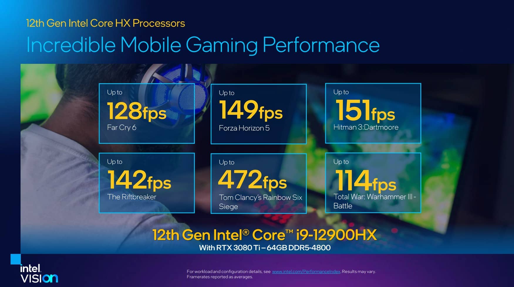 Nếu được trang bị cho những chiếc laptop chơi game thì Alder Lake-HX cũng cho hiệu năng rất tốt. Core i9-12900HX đi với RTX 3080 Ti và 64 GB DD5-4800, một chiếc máy cấu hình chạm nóc như vậy có thể cho 128 fps với Far Cry 6, 149 fps với Forza Horizon 5, 151 fps với Hitman 3: Dartmoore, 472 fps với Rainbow Six Siege. Intel không nói về thiết lập đồ họa và độ phân giải nhưng khả năng là các game được test ở 1080p.