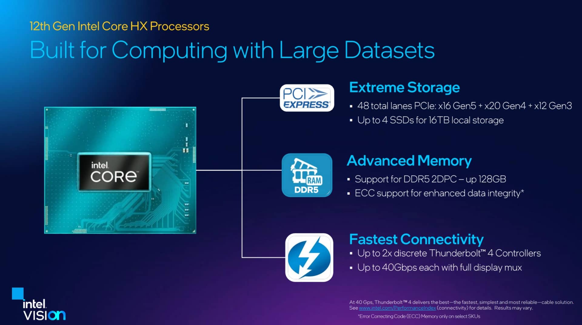 Hướng đến phân khúc máy trạm thì Alder Lake-HX còn đem cả ưu thế của Alder Lake-S xuống nền tảng di động đó là việc hỗ trợ số lane PCIe nhiều hơn và chuẩn PCIe mới hơn. Trong khi Alder Lake-H chỉ hỗ trợ tối đa 8 lane PCIe 4.0 (16 lane PCIe 3.0) cho GPU, 8 lane PCIe 4.0 cho SSD và 12 lane PCIe 3.0 thì Alder Lake-HX giờ hỗ trợ đến 16 lane PCIe 5.0 (32 lane PCIe 4.0 hay 64 lane PCIe 3.0) cho GPU (thiết lập x16 hoặc 2 x8), 20 lane PCIe 4.0 hỗ trợ tối đa 4 ổ SSD PCIe 4.0 x4 (hỗ trợ RAID 1, 0 và 5) và 2 vi điều khiển Thundertbolt 4, thêm vào đó là 12 lane PCIe 3.0 từ PCH cấp cho các cổng kết nối USB, SATA, thiết bị dùng PCIe chẳng hạn như card Wi-Fi 6E, khe đọc thẻ SD …