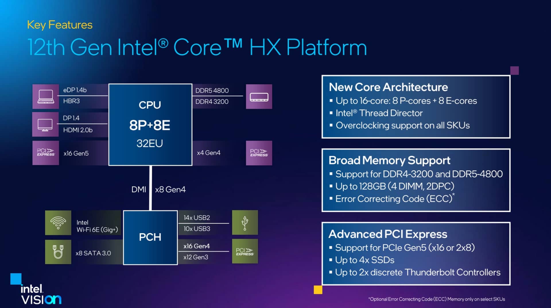 Alder Lake-HX vẫn sẽ hỗ trợ 2 loại bộ nhớ RAM là DDR5-4800 hoặc DDR4-3200 nhưng việc chiếc laptop dùng loại RAM gì sẽ tùy thuộc vào hãng làm laptop. Cũng không ngạc nhiên khi Alder Lake-HX không hỗ trợ các loại RAM tiết kiệm điện như LPDDR4X/LPDDR5 bởi chúng được thiết kế cho laptop hiệu năng cao. Thế nhưng đổi lại là tính năng ECC - không cần đến Xeon, Core i thế hệ 12 dòng Alder Lake-HX hỗ trợ cả RAM có tính năng tự động sửa lỗi và đây cũng là trang bị thường thấy trên những chiếc máy trạm. Dung lượng RAM hỗ trợ cũng tăng lên tối đa 128 GB, gấp đôi so với Alder Lake-H với thiết lập 2 thanh DIMM mỗi kênh.