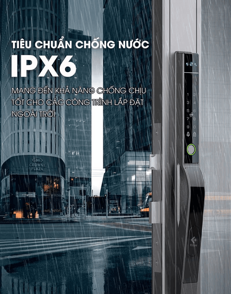 Một trong những ưu điểm vượt trội của Khóa cửa thông minh Kitos ALS5 Face ID là khả năng chống nước theo tiêu chuẩn IP X6, giúp khóa hoạt động ổn định và bền bỉ trong mọi điều kiện thời tiết, kể cả khi tiếp xúc trực tiếp với mưa lớn. Đây là tính năng cực kỳ quan trọng đối với các sản phẩm khóa ngoài trời, giúp khóa luôn giữ vững hiệu suất và bảo vệ ngôi nhà của bạn một cách tuyệt đối.