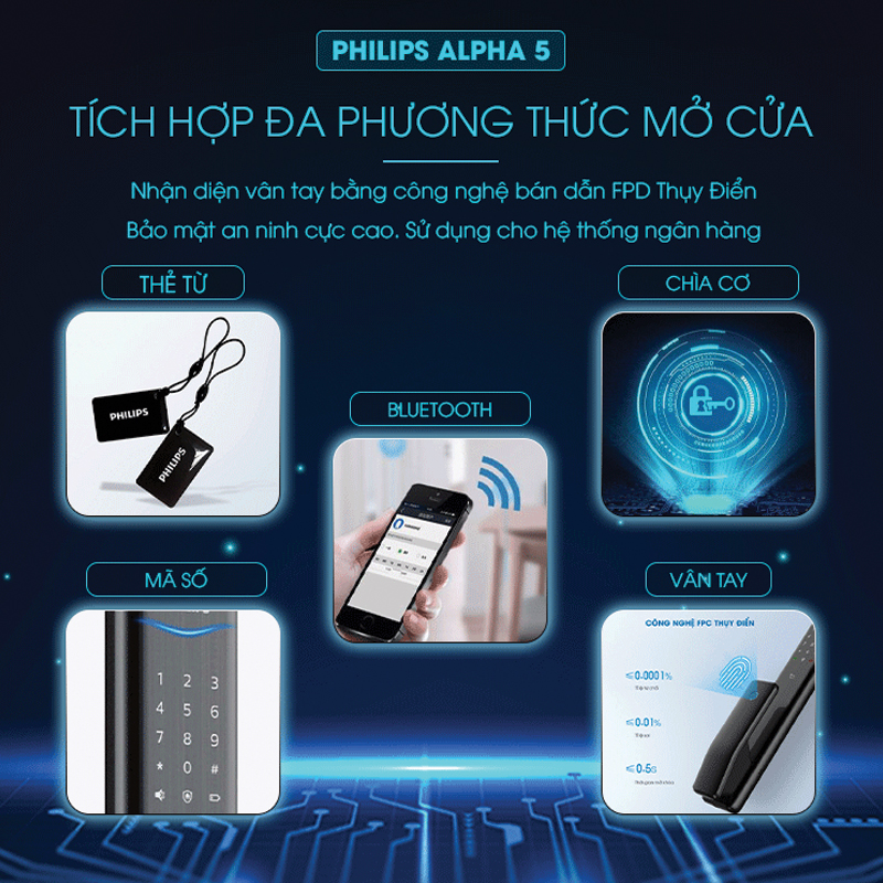 Philips Alpha-5 sử dụng các phương thức bảo mật tiên tiến như: vân tay, mã số, thẻ từ, chìa cơ, bluetooth. Khóa có sức chứa tới 10 mã số, 100 vân tay, 100 thẻ từ, giúp việc quản lý khóa thoải mái, dễ dàng. Công nghệ nhận diện vân tay FPC Thụy Điển. Nhận diện vân tay dựa trên cảm ứng điện dung, nhiệt độ, áp suất. Nhận diện vân tay chưa đến 0,5 giây, ngăn ngừa hoàn toàn vân tay giả.