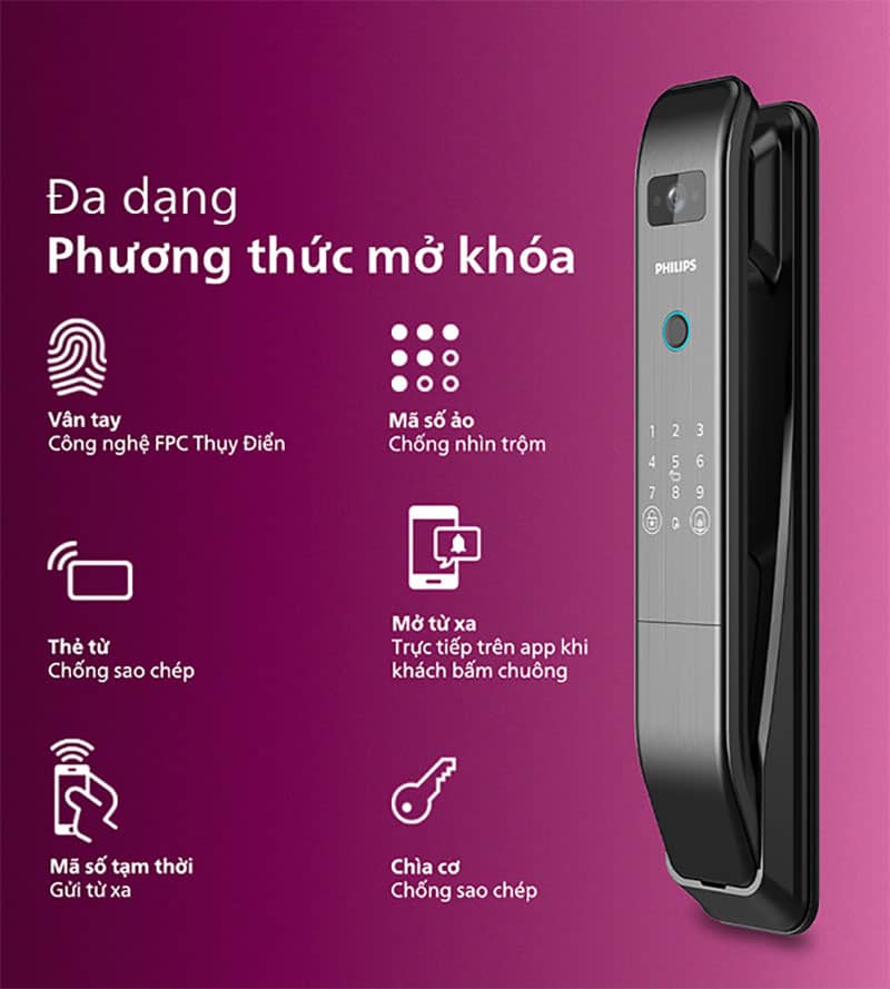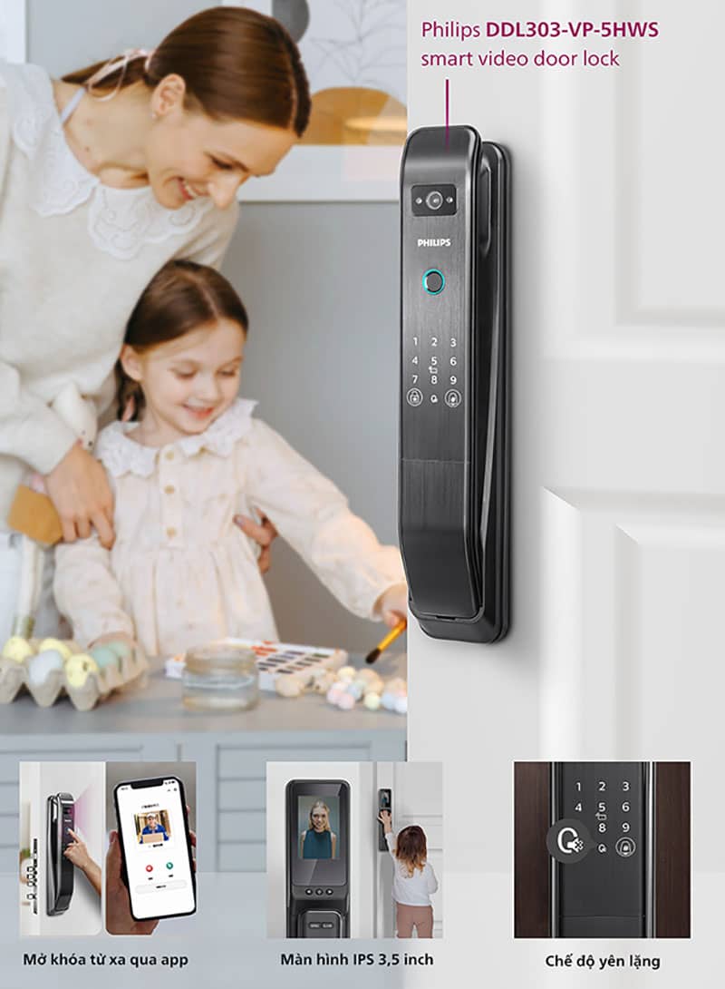 Được ứng dụng công nghệ hiện đại kết hợp cùng các phương thức truyền thống, khóa cửa thông minh Khóa thông minh Philips DDL303 trang bị đầy đủ phương thức mở khóa truyền thống cùng chuông hình thông minh đàm thoại 2 chiều thân thiện với người dùng.