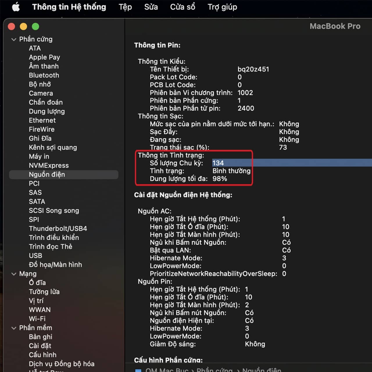 - Pin: Vào Cài đặt hệ thống > Pin > Tình trạng pin (Battery Health) để xem dung lượng pin hiện tại so với dung lượng thiết kế. Một chiếc MacBook cũ có số chu kỳ sạc (cycle count) dưới 500 thường còn tốt. Nếu pin hiển thị thông báo “Cần thay thế” (Service Battery), hãy cân nhắc chi phí thay pin.