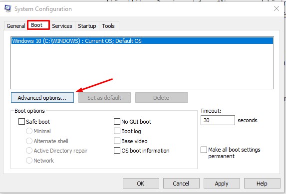 Bước 2: Chuyển đến tab "Boot" và chọn Advanced options