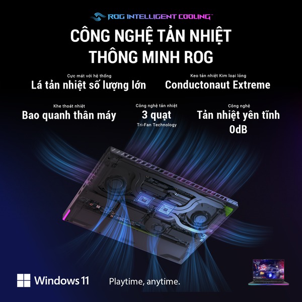 ASUS cũng rất chú trọng đến hệ thống tản nhiệt trên ROG Strix G18. Công nghệ ROG Intelligent Cooling với 3 quạt tản nhiệt và keo tản nhiệt kim loại lỏng Conductonaut Extreme đảm bảo máy luôn mát mẻ ngay cả khi hoạt động ở cường độ cao. Bạn có thể chiến game hàng giờ liền mà không lo bị quá nhiệt.