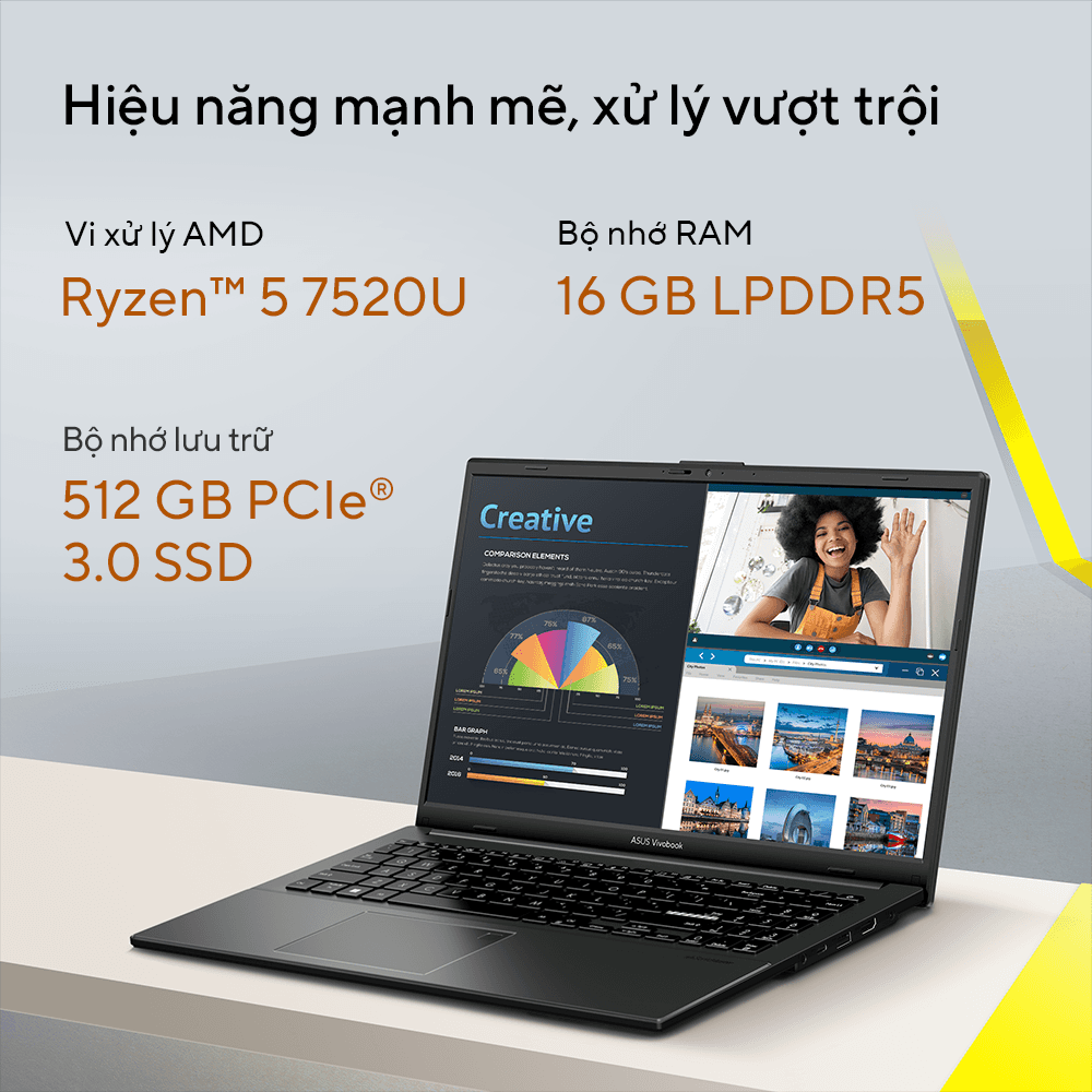 Bên trong vẻ ngoài mỏng nhẹ là sức mạnh hiệu năng đáng kinh ngạc nhờ được trang bị vi xử lý AMD Ryzen 5 7520U với 4 nhân 8 luồng, xung nhịp tối đa lên đến 4.3GHz rất tiết kiệm năng lượng, góp phần kéo dài thời lượng sử dụng pin. Máy được tích hợp 16GB RAM LPDDR5 Onboard cho phép bạn đa nhiệm thoải mái mở nhiều ứng dụng cùng lúc mà không bị giật lag. Bên cạnh đó, ổ cứng SSD 512GB M.2 NVMe PCIe 3.0 tốc độ cao khởi động máy và truy cập dữ liệu chỉ trong tích tắc.