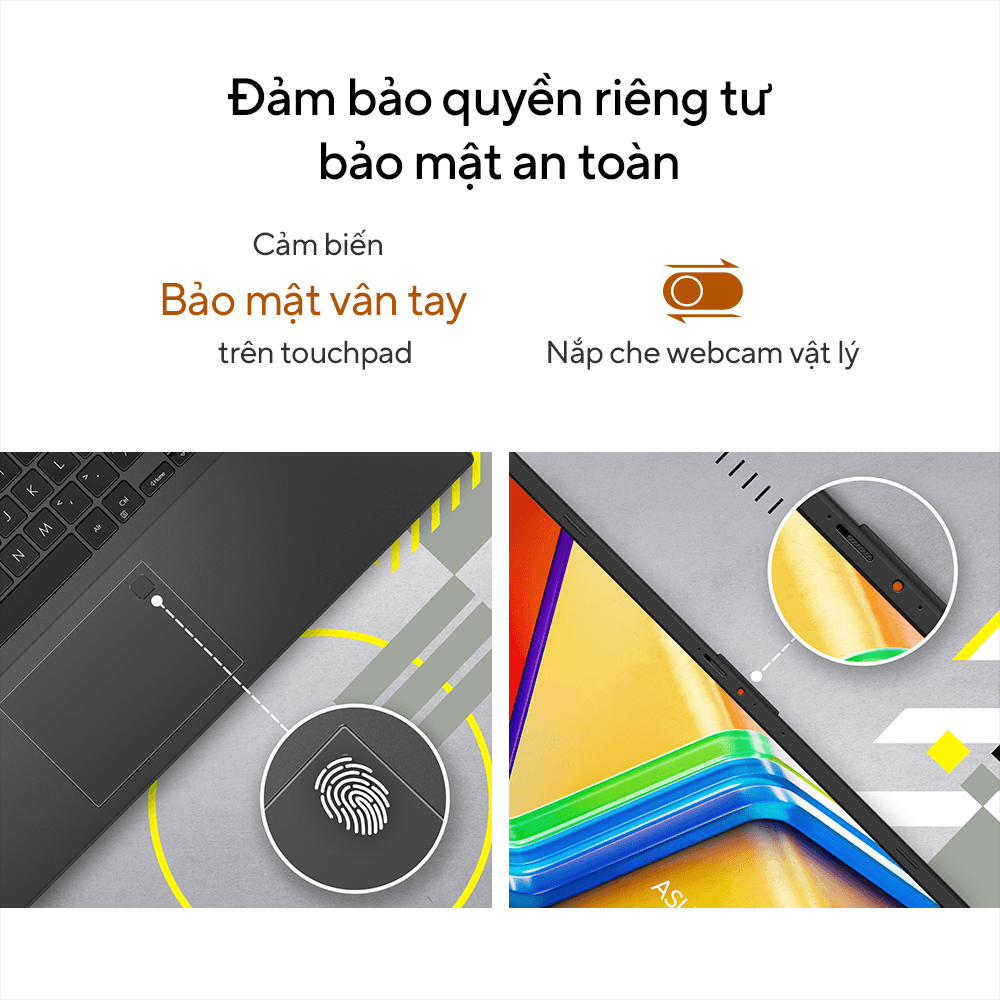 Cảm biến vân tay tích hợp trên touchpad cho phép mở khóa thiết bị nhanh chóng và an toàn chỉ bằng một chạm. Thêm vào đó, tấm che webcam vật lý là một tính năng nhỏ nhưng quan trọng bảo vệ hình ảnh riêng tư của bạn khỏi những ánh mắt tò mò hoặc các phần mềm độc hại mang lại sự an tâm tuyệt đối khi sử dụng máy.