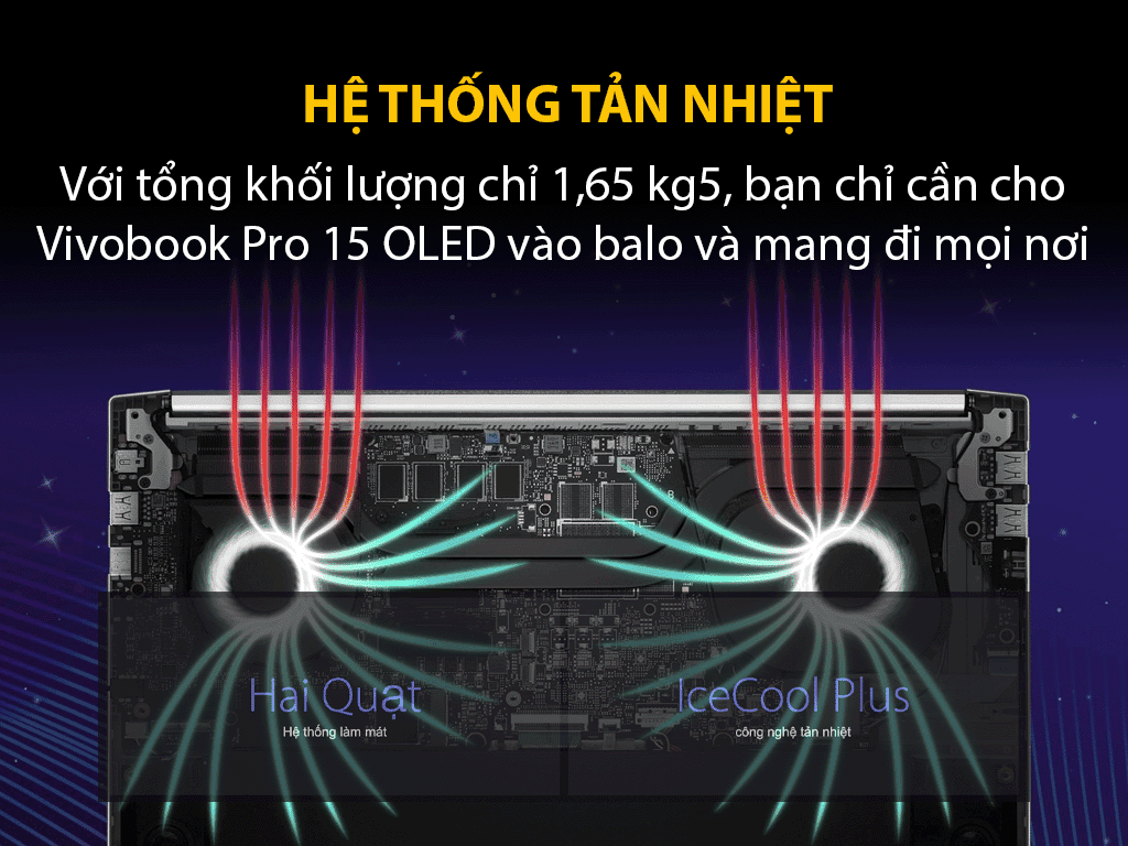 Nhiệt độ không còn là nỗi lo với hệ thống quạt kép ASUS IceCool Plus - Công nghệ tản nhiệt tiên tiến giữ cho máy luôn mát mẻ, ngay cả khi bạn chơi game hoặc render video trong thời gian dài. 3 chế độ quạt tùy chỉnh qua phần mềm MyASUS, bạn có thể linh hoạt điều chỉnh giữa hiệu năng tối đa và tiết kiệm năng lượng.