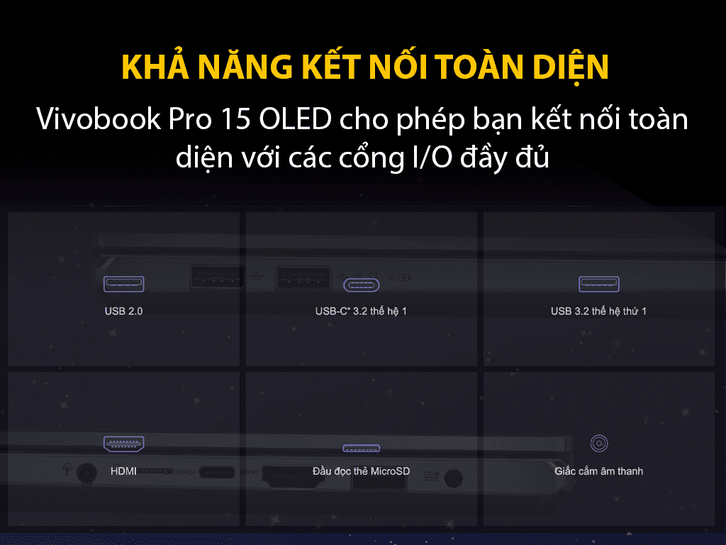 Máy được trang bị đầy đủ cổng kết nối hiện đại: USB 3.2 Gen 1 Type-C, USB 3.2 Gen 1 Type-A, 2x USB 2.0 Type-A, HDMI 1.4, jack tai nghe 3.5mm và khe MicroSD. Kết nối không dây với Wi-Fi 6 (802.11ax) và Bluetooth 5.0 tốc độ nhanh, ổn định. Bạn có thể dễ dàng kết nối với màn hình ngoài, thiết bị ngoại vi hay chuyển dữ liệu mà không gặp bất kỳ trở ngại nào.