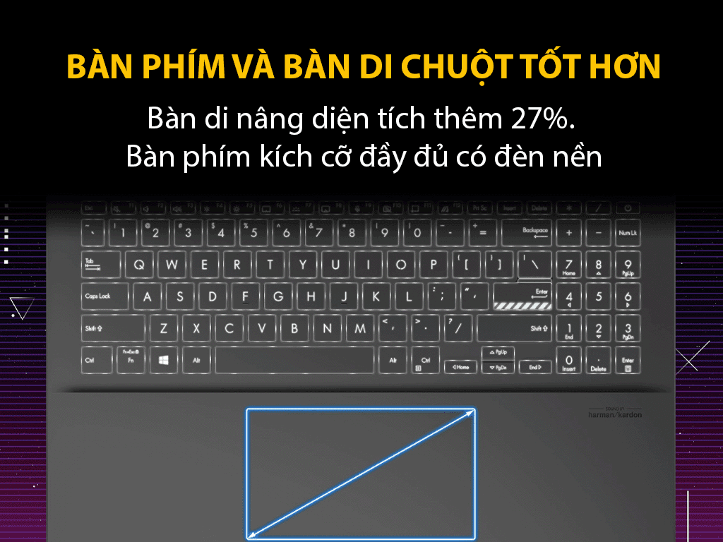 Bàn phím full-size với đèn nền và hành trình phím 1.35mm, trải nghiệm cảm giác gõ thoải mái, chính xác, đặc biệt hữu ích trong môi trường thiếu sáng. Touchpad được mở rộng thêm 27% hỗ trợ cử chỉ đa điểm mượt mà điều khiển dễ dàng như một thiết bị cao cấp. Thêm vào đó, cảm biến vân tay tích hợp tăng cường bảo mật, cho phép đăng nhập nhanh chóng và an toàn.