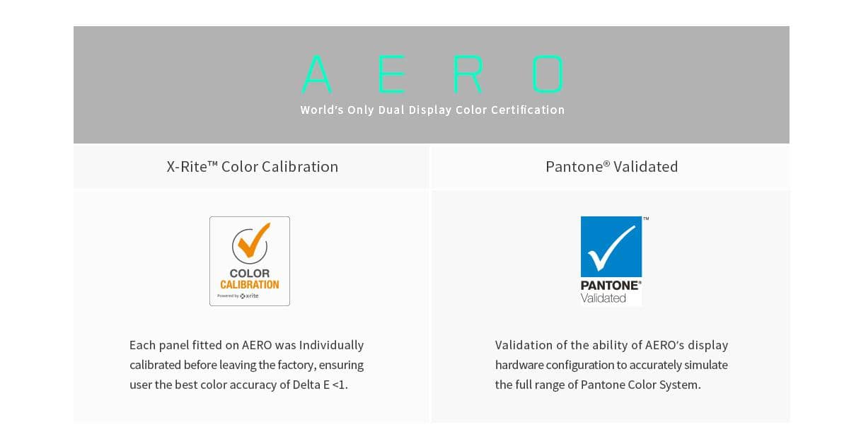 Các panel được hiệu chuẩn từng tấm một theo Hiệu chuẩn Màu X-rite™ trước khi xuất xưởng, đảm bảo tiêu chuẩn nghiêm ngặt Delta E nhỏ hơn 1³. Hơn nữa, chứng nhận Pantone® Validated xác minh khả năng cấu hình phần cứng màn hình của AERO có thể mô phỏng chính xác toàn bộ phạm vi của Hệ màu Pantone. Điều này cho phép các nhà thiết kế và nhà sản xuất làm việc với bảng màu Pantone chính xác và nâng cao hiệu quả công việc. Hầu hết các máy tính xách tay sáng tạo trên thị trường được chọn ngẫu nhiên chỉ để tiến hành chứng nhận Pantone® Validated. Dòng máy tính xách tay AERO đã tiến một bước xa hơn và đạt được chứng chỉ Hiệu chuẩn X-rite ™. Điều này sẽ đảm bảo người sáng tạo có quyền truy cập vào tất cả các bảng màu hoàn hảo, độ chính xác cao ngay khi họ bật máy tính xách tay AERO của mình.