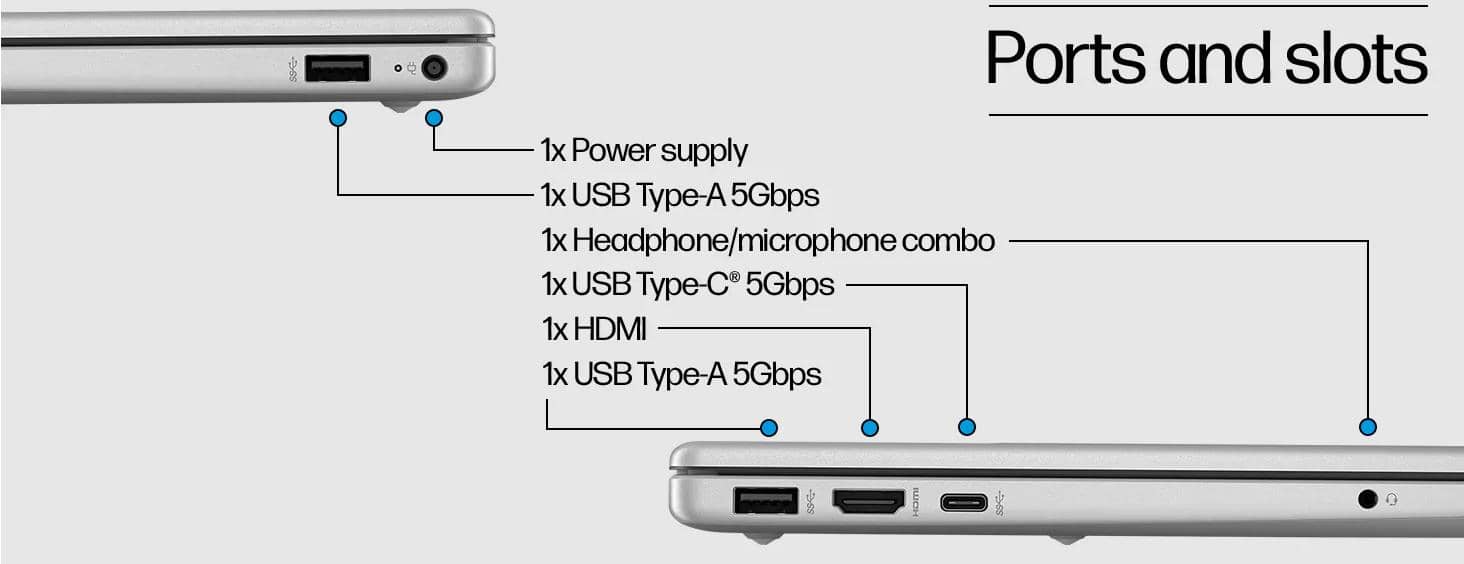 Dù mỏng nhẹ, HP 15-fd0237TU 9Q972PA vẫn được trang bị đầy đủ các cổng kết nối cần thiết. Bạn sẽ có 1 cổng USB Type-C 5Gbps, 2 cổng USB Type-A 5Gbps để truyền dữ liệu siêu tốc, 1 cổng HDMI 1.4b để xuất hình ảnh ra màn hình lớn hay máy chiếu, cùng với jack cắm tai nghe/microphone combo. Camera HP True Vision 720p HD tích hợp công nghệ giảm nhiễu, bạn sẽ có những cuộc họp trực tuyến hay video call chất lượng cao.