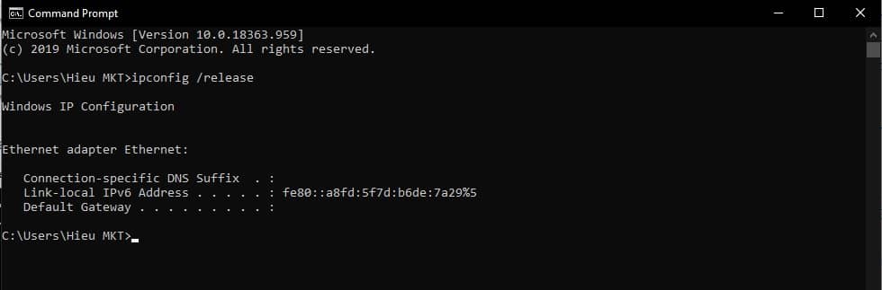 - Bước 3: Cửa sổ cmd hiện ra bạn sử dụng lệnh ipconfig /release ⏩ sau đó nhấn Enter để thực hiện: Lệnh này giúp bạn xóa IP cũ đang bị lỗi.