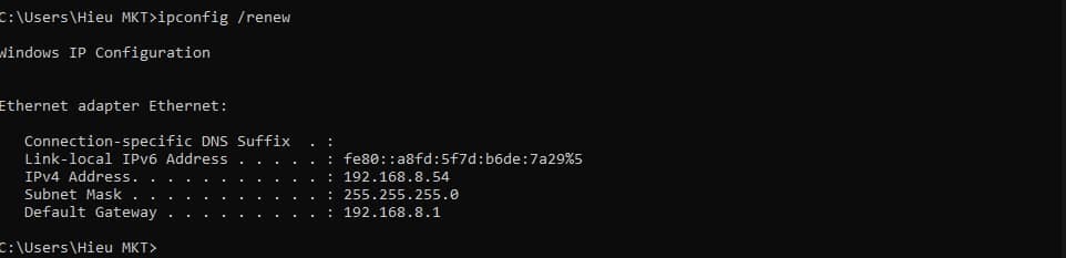 Bước 4: Tiếp theo bạn gõ tiếp lệnh ipconfig /renew để máy tính nhận giải IP mới.