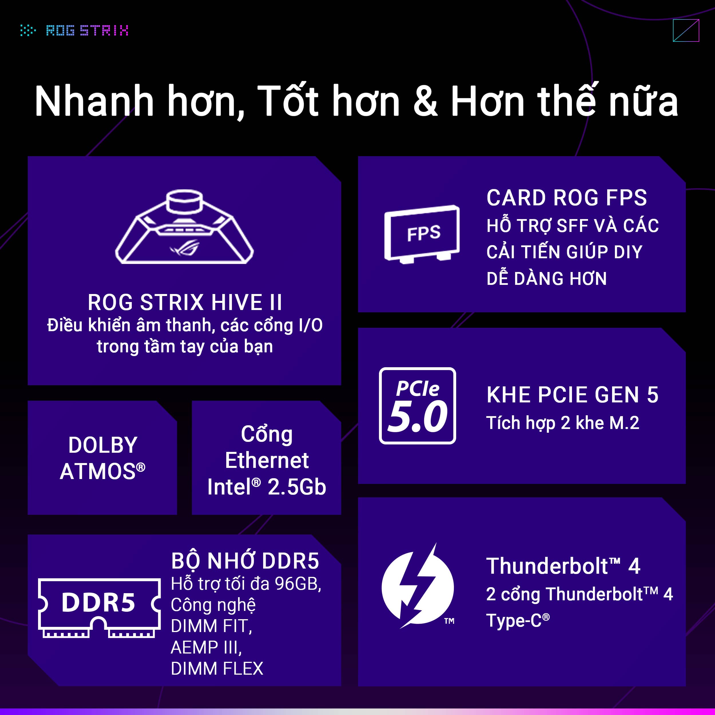 | Các tính năng độc đáo | Phần mềm độc quyền ROG - ROG CPU-Z - Dolby Atmos Phần mềm độc quyền ASUS Armoury Crate - Aura Creator - Aura Sync - Fan Xpert 4 (with AI Cooling II) - GameFirst - Power Saving HWiNFO AIDA64 Extreme (60 days free trial) ASUS AI Advisor ASUS Driver Hub ASUS GlideX Adobe Creative Cloud (Free Trial) Norton 360 for Gamers (60 Days Free Trial) WinRAR (40 Days Free Trial) UEFI BIOS AI Overclocking Guide ASUS EZ DIY - ASUS CrashFree BIOS 3 - ASUS EZ Flash - ASUS UEFI BIOS EZ Mode - ASUS MyHotkey NPU Boost |
