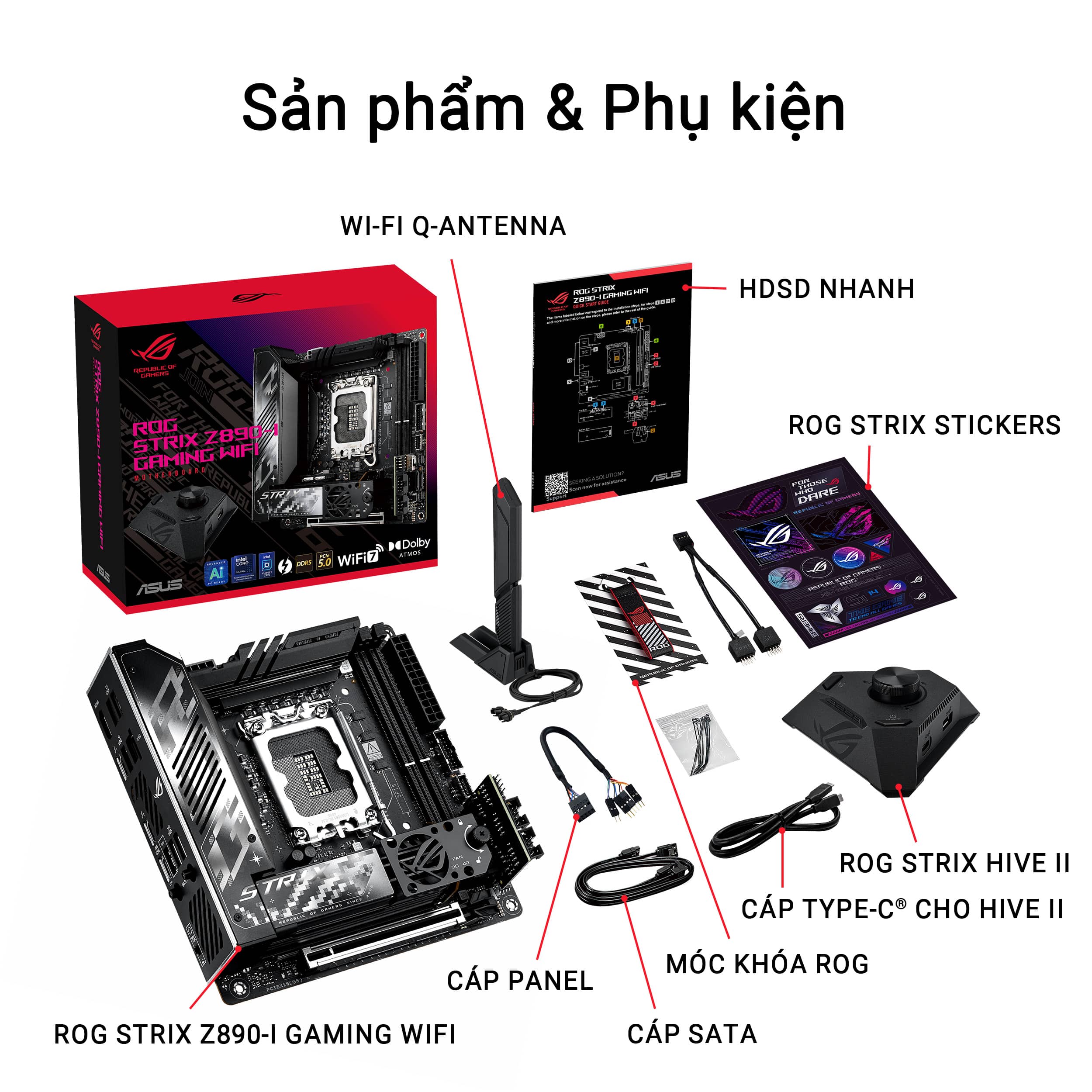 Âm thanh | Tính năng âm thanh của ROG Strix Hive II - Công nghệ ROG Hyper-Grounding - DAC ESS SABRE9260Q - Giắc cắm âm thanh mạ bạc - Lớp PCB âm thanh chuyên dụng * Tất cả chức năng âm thanh trên ROG STRIX Z890-I GAMING WIFI đều được hỗ trợ thông qua ROG STRIX HIVE II. |