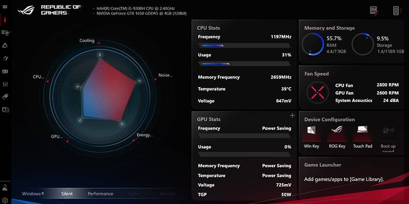 Phần mềm Armory Crate độc quyền của ASUS tập trung quyền kiểm soát tất cả các sản phẩm chơi game được hỗ trợ. Một giao diện trực quan duy nhất cho phép bạn tùy chỉnh ánh sáng RGB cho tất cả các thiết bị tương thích và liên kết chúng với Aura Sync để có ánh sáng thống nhất. Nó cũng hiển thị thông tin từ và cho phép kiểm soát hệ sinh thái phần cứng đang phát triển. Armory Crate cũng cho phép đăng ký sản phẩm dễ dàng và có phần tin tức để giúp bạn giữ liên lạc với cộng đồng trò chơi.