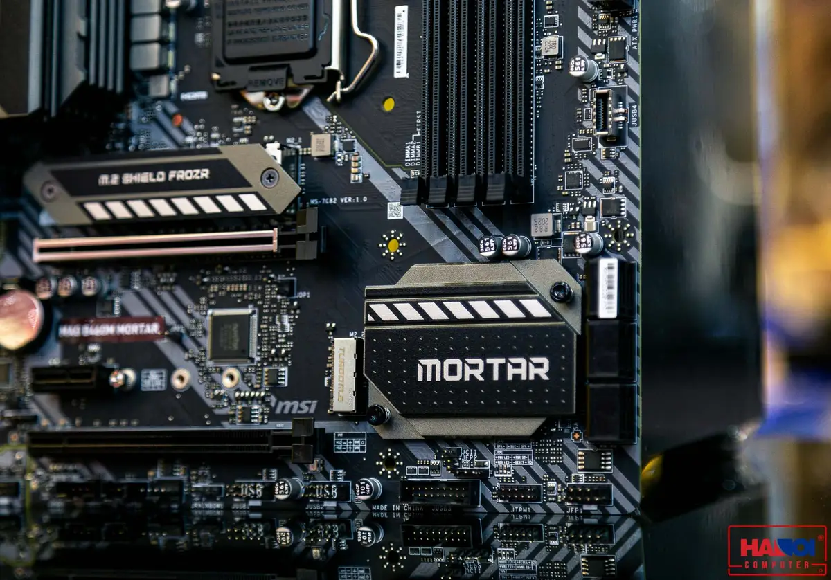 Một trong những điểm giá trị nhất trên Mainboard MSI MAG B460M MORTAR chính là hệ thống tản nhiệt được đầu tư bài bản. MSI đã trang bị các khối Heatsink bằng kim loại có kích thước lớn, bao phủ hoàn toàn khu vực VRM (mạch nguồn). Nhờ vậy giúp giải nhiệt cực nhanh cho các linh kiện quan trọng, đảm bảo rằng ngay cả khi bạn chạy các tác vụ nặng như render video hay chơi game AAA trong nhiều giờ liền, hệ thống vẫn duy trì được mức nhiệt độ lý tưởng, tránh tình trạng hạ xung nhịp do quá nóng.