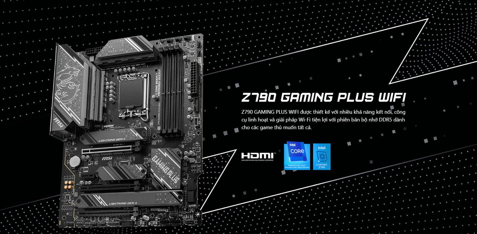 Mainboard PC MSI Z790 GAMING PLUS WIFI hỗ trợ ép xung RAM DDR5 đến 7200+(OC) MHz, cung cấp khả năng truy cập băng thông bộ nhớ và bổ sung các vùng che chắn giúp giảm đáng kể nhiễu xuyên âm.