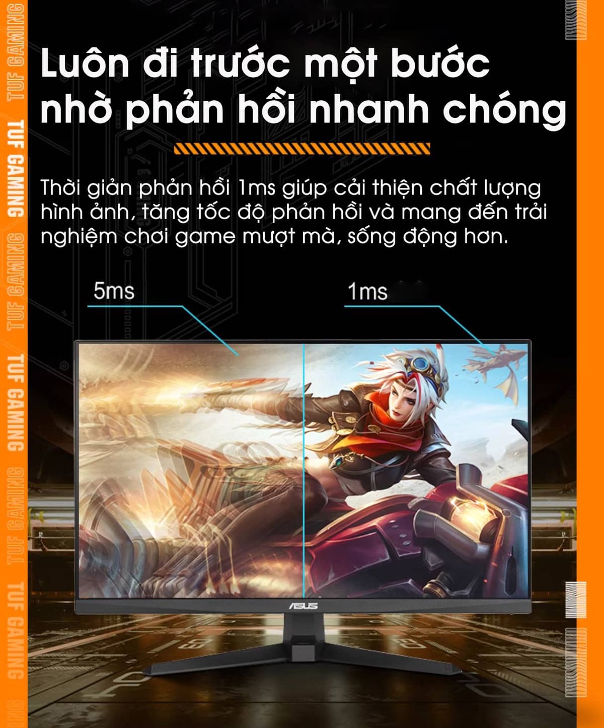 Thời gian phản hồi 1ms MPRT của TUF VG259Q3 đảm bảo hình ảnh được hiển thị chính xác và tức thời, giúp bạn loại bỏ hiện tượng nhòe hình, tăng cường độ sắc nét cho các vật thể chuyển động nhanh, mang đến trải nghiệm chơi game sống động và chân thực.