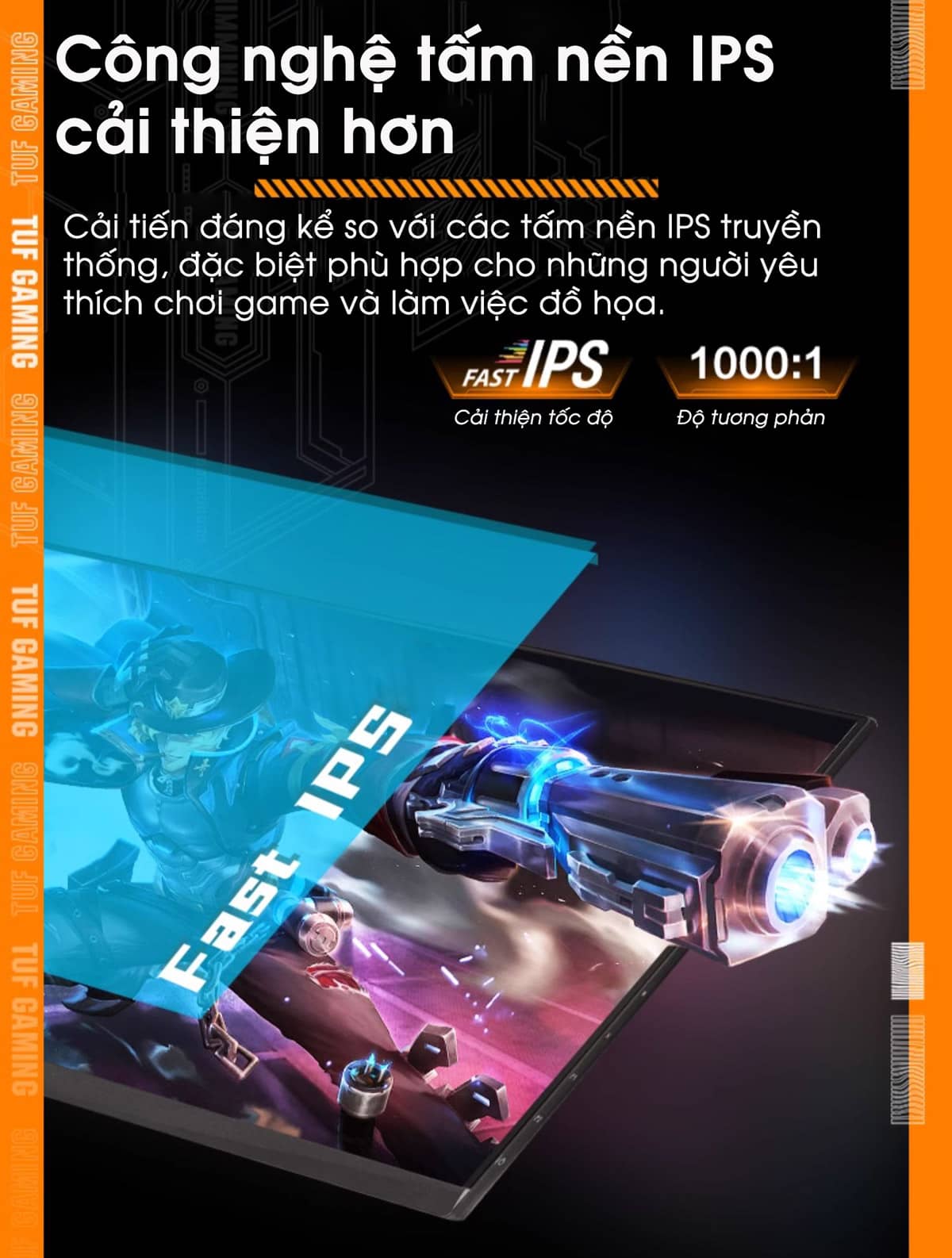 Điểm nổi bật đầu tiên của TUF VG259Q3 chính là việc trang bị tấm nền Fast IPS. So với tấm nền IPS truyền thống, Fast IPS khắc phục được nhược điểm về thời gian phản hồi, mang đến hình ảnh chuyển động mượt mà, giảm thiểu hiện tượng bóng mờ, giúp bạn không bỏ lỡ bất kỳ chi tiết nào trong game.