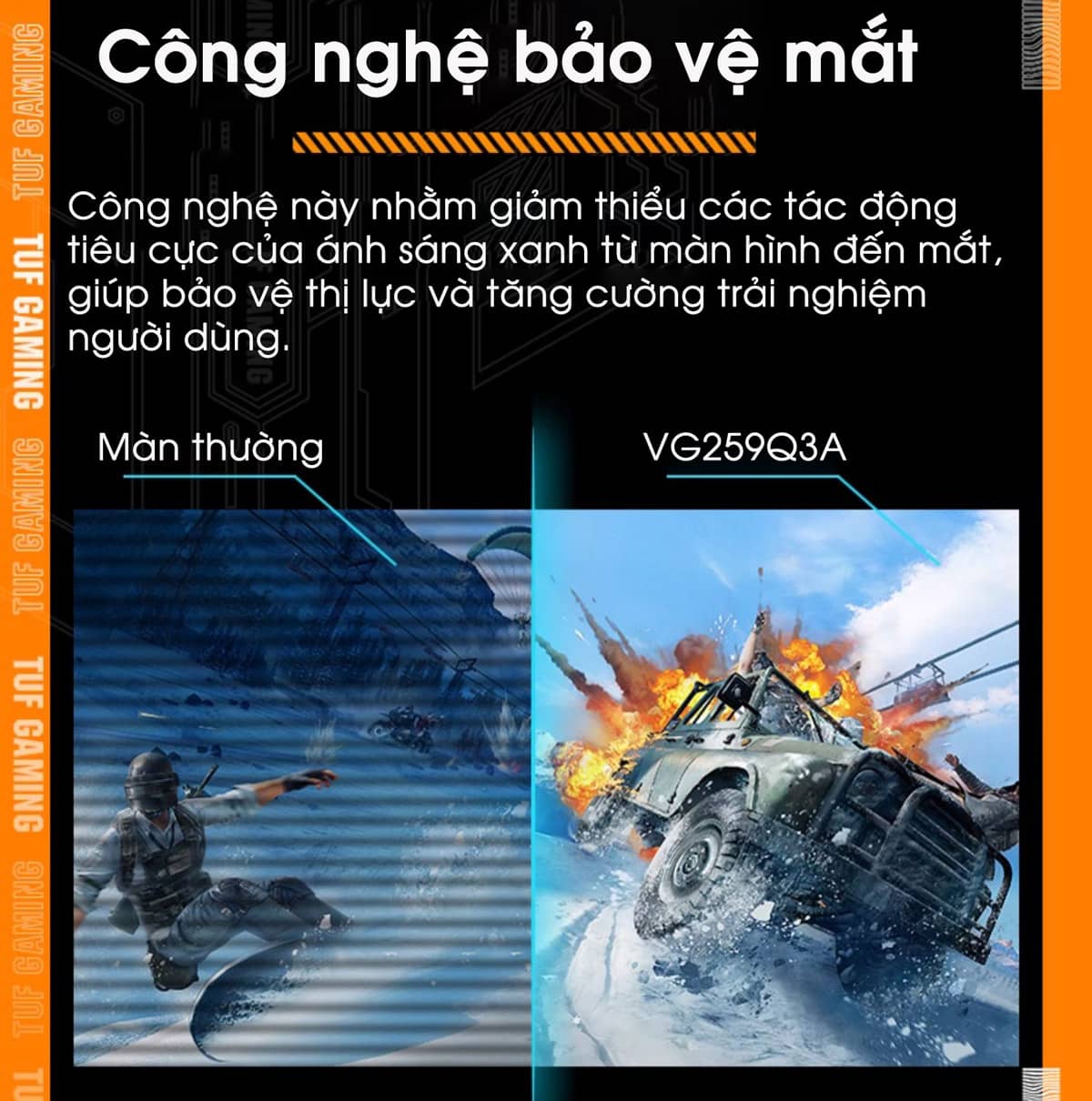 TUF VG259Q3 được trang bị công nghệ Low Blue Light giúp giảm thiểu lượng ánh sáng xanh có hại, bảo vệ mắt của bạn trong quá trình sử dụng dài, ngăn ngừa tình trạng mỏi mắt, nhức đầu.