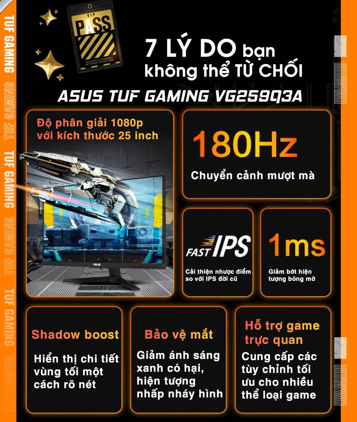 ASUS TUF VG259Q3 là một lựa chọn hoàn hảo cho những game thủ đam mê tốc độ và hình ảnh sắc nét. Với những công nghệ hiện đại và thiết kế ấn tượng, màn hình này chắc chắn sẽ mang đến cho bạn những trải nghiệm chơi game tuyệt vời nhất.