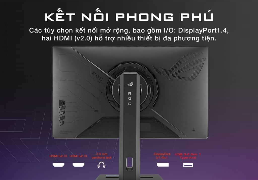 Màn hình ROG Strix XG259QNS được trang bị nhiều cổng kết nối, bao gồm DisplayPort 1.4 và HDMI 2.0. Điều này giúp người dùng dễ dàng kết nối màn hình với nhiều thiết bị khác nhau, từ máy tính, laptop đến các thiết bị chơi game console. Các cổng kết nối này đều hỗ trợ tần số quét cao, đảm bảo trải nghiệm chơi game mượt mà và không bị gián đoạn.
