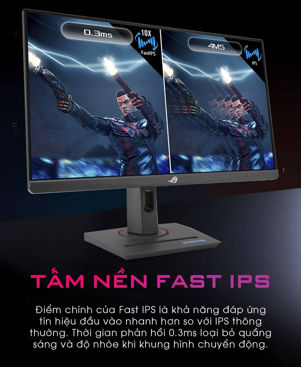 Bên cạnh tần số quét ấn tượng, ROG Strix XG259QNS còn sở hữu tốc độ phản hồi tín hiệu chỉ 0.3ms (GTG), một trong những tốc độ nhanh nhất hiện nay. Tốc độ phản hồi nhanh này giúp loại bỏ hiện tượng bóng mờ và nhòe hình, đảm bảo mọi chuyển động trên màn hình đều rõ ràng và chính xác. Điều này đặc biệt quan trọng đối với các game thủ chuyên nghiệp, nơi mỗi mili giây đều có thể quyết định kết quả của trận đấu