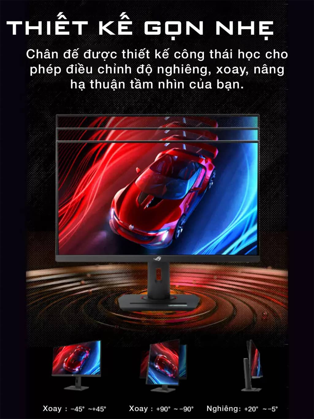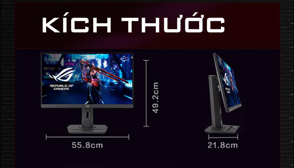 Màn hình ROG Strix XG259QNS có thiết kế hiện đại với viền mỏng và chân đế chắc chắn. Kích thước vừa vặn, không quá lớn cũng không quá nhỏ, phù hợp với nhiều không gian làm việc và chơi game.