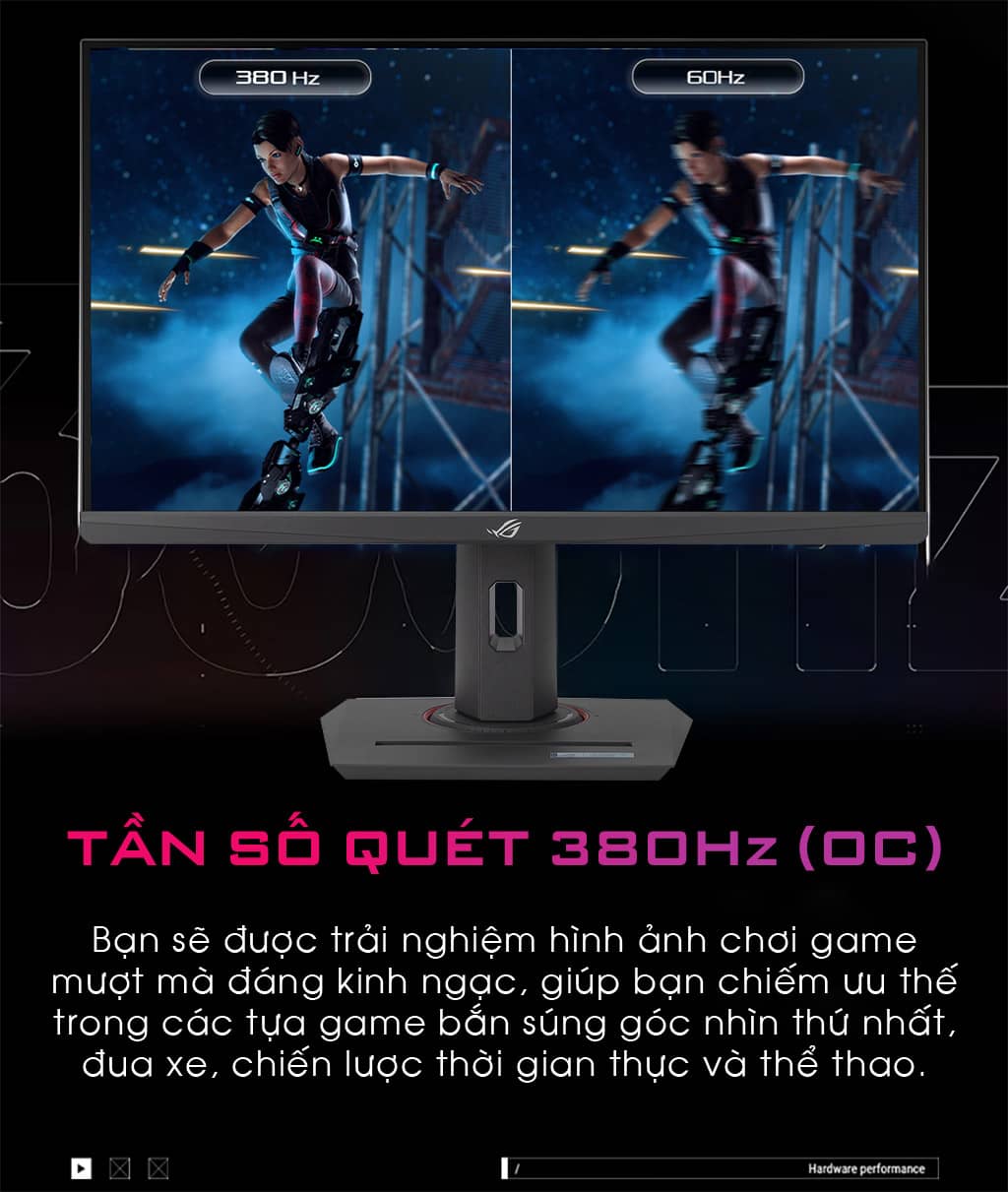ROG Strix XG259QNS nổi bật với tần số quét lên đến 380Hz, một con số ấn tượng trong thế giới màn hình chơi game. Tần số quét cao này giúp giảm thiểu hiện tượng nhòe hình và giật lag, mang lại trải nghiệm chơi game mượt mà và sắc nét hơn. Đặc biệt, trong các tựa game đòi hỏi tốc độ và phản xạ nhanh như bắn súng góc nhìn thứ nhất (FPS) hay đua xe, tần số quét cao sẽ giúp người chơi có lợi thế lớn hơn, dễ dàng theo dõi và phản ứng kịp thời với mọi tình huống trong game.