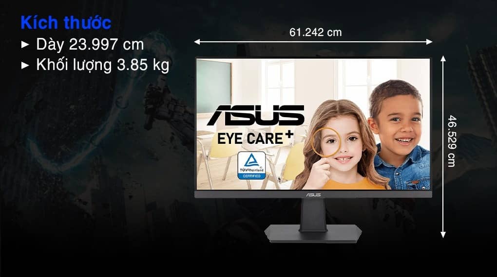 Màn hình Asus VA27EHF có trọng lượng tổng thể 3.85 kg cùng kích thước rộng 61.2 cm, cao 46.5 cm . Dù chân đế được cấu thành từ nhựa nhưng vẫn tỏ rõ sự cứng cáp thiết kế gọn nhẹ, mang đến sự di động cho phép bạn di chuyển đến bất kỳ vị trí nào trên bàn làm việc hay bàn học một cách dễ dàng.