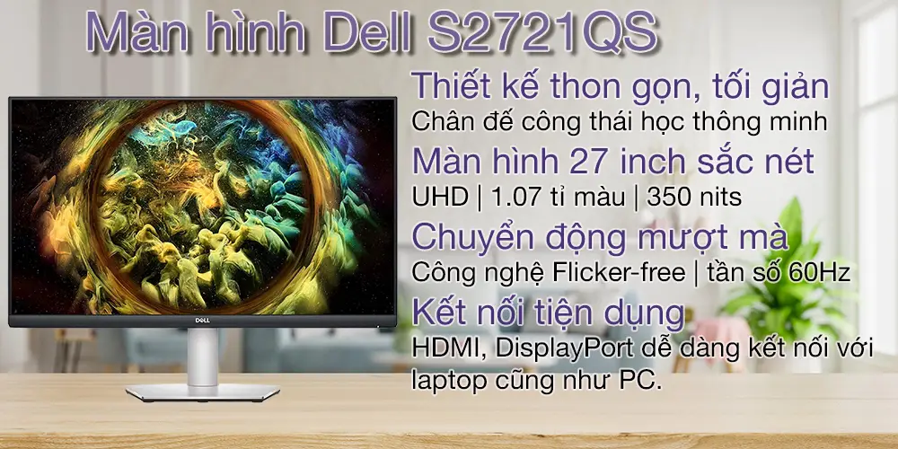 Màn hình Dell S2721QS - Được định vị là dòng màn hình giải trí và đồ họa cận cao cấp, nâng tầm mọi trải nghiệm thị giác của bạn lên một đẳng cấp hoàn toàn mới. Kích thước 27 inch sở hữu độ phân giải 4K UHD cùng khả năng hiển thị hơn 1 tỷ màu sắc sẽ là người đồng hành đáng tin cậy giúp bạn chinh phục những tiêu chuẩn khắt khe nhất của công việc đồ họa hiện đại.