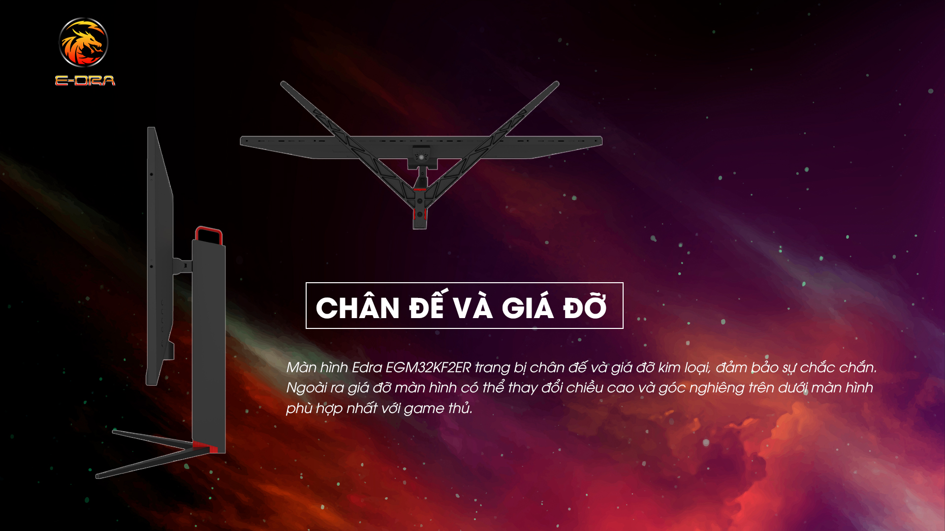 Màn hình máy tính Gaming E-Dra EGM32KF2ER này, chính là thiết kế nâng xoay uốn lượn linh hoạt. Ở tư thế thông thường, các bạn có thể nâng cao khung màn này lên tới một mức tối đa là 90mm (9cm). Và vẫn ở tư thế đó, các bạn có thể hạ xuống khung màn này xuống một mức tối đa chỉ còn 90mm (9cm). Tổng thể khoảng cách nâng lên hạ xuống từ vị trí thấp nhất cho tới vị trí cao nhất của chiếc Màn hình máy tính Gaming E-Dra EGM32KF2ER là 180mm (18cm).
