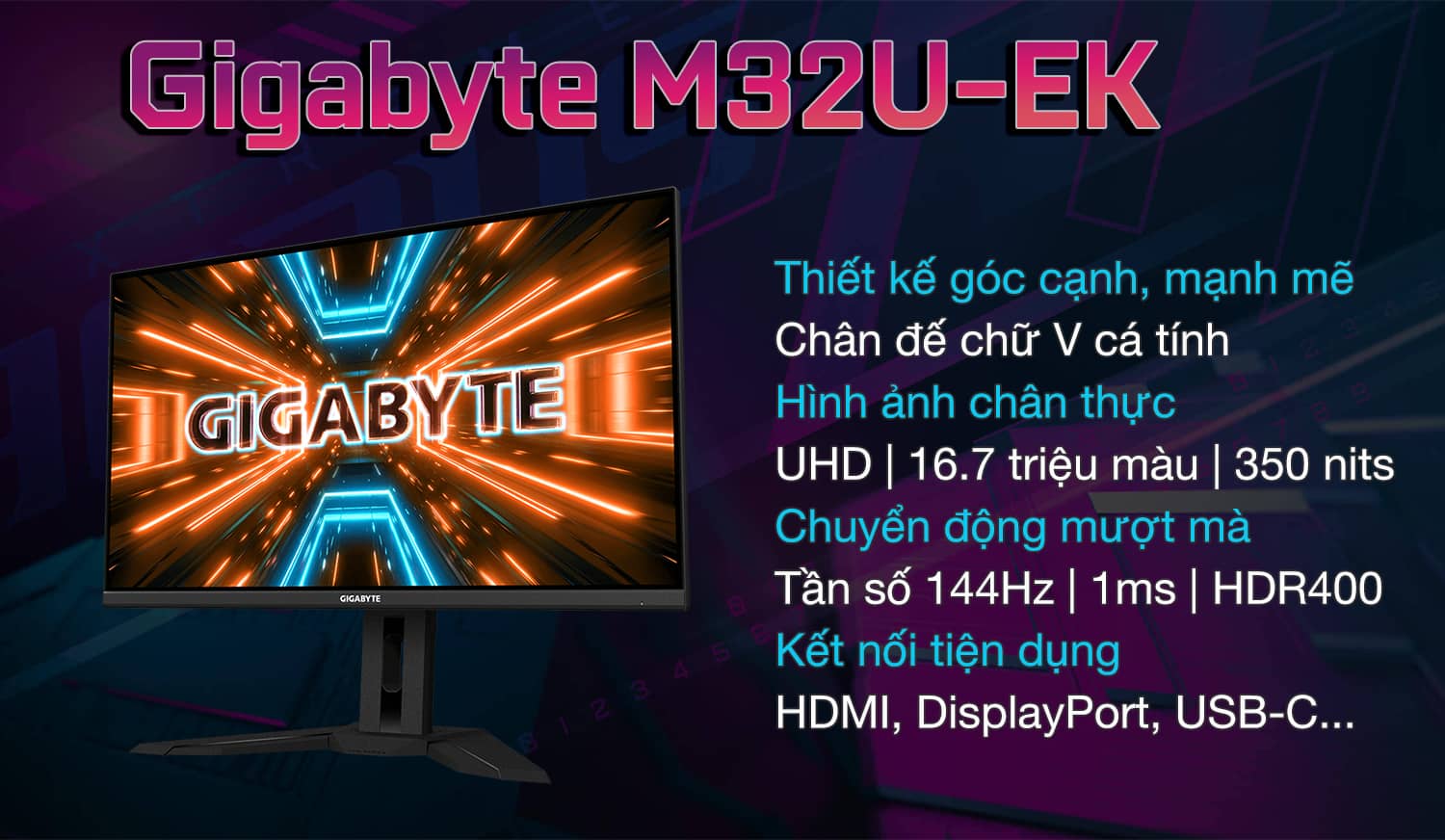 Thật tuyệt vời khi sử dụng trong văn phòng hoặc tạo phương tiện, vì màn hình lớn, độ phân giải cao rất phù hợp cho đa nhiệm và nó có độ rõ nét tuyệt vời của văn bản. Gigabyte M32U là màn hình 32 inch 4k với tốc độ làm mới nhanh 144Hz. Đây là một trong số ít màn hình có cổng HDMI 2.1, khiến nó trở thành lựa chọn tuyệt vời cho các game thủ console, vì nó có thể tận dụng tối đa hầu hết những gì mà Sony PS5 và Xbox Series S/X cung cấp, bao gồm chơi game 4k @ 120Hz. Nó cũng có một vài tính năng bổ sung được thiết kế để tăng năng suất, bao gồm công tắc chuột và video bàn phím tích hợp (KVM), vì vậy bạn có thể điều khiển hai nguồn bằng một bàn phím và chuột.