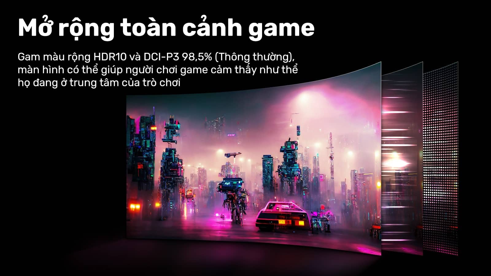 Màu sắc tuyệt đẹp nhờ phạm vi bao phủ gam màu DCI-P3 rộng 98,5% (kích thước tương đối ~135% sRGB). Ngoài ra còn có chế độ mô phỏng sRGB, trong trường hợp bạn thích màu sắc tự nhiên và chính xác hơn cho nội dung SDR.